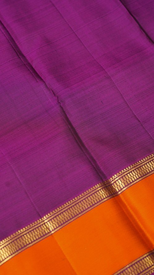 A classic piece of heritage ! This stunning dark blue Kanjivaram handloom saree features intricate Rudraksha buttas all over. A vibrant orange border adds a pop of contrast, while the rich majanta pallu shines with gold zari weaving. Perfect for special occasions and statement-making