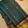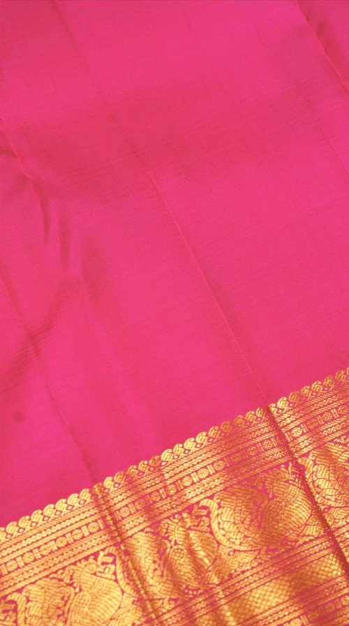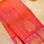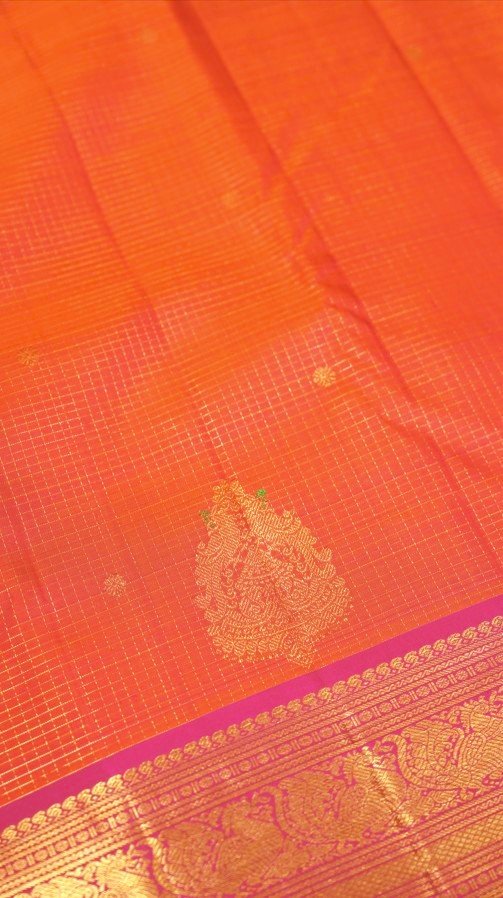 This vibrant Kanjivaram silk saree features a luminous orange body, intricately woven with a fine checked pattern and delicate floral motifs in gold zari. A distinctive row of majestic peacock motifs is gracefully placed just above the rich pink border, adding a unique and traditional touch. The wide pink border itself is meticulously crafted with elaborate gold zari work, providing a stunning and festive contrast that makes this saree a true masterpiece of craftsmanship.
