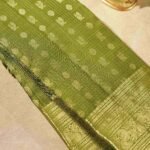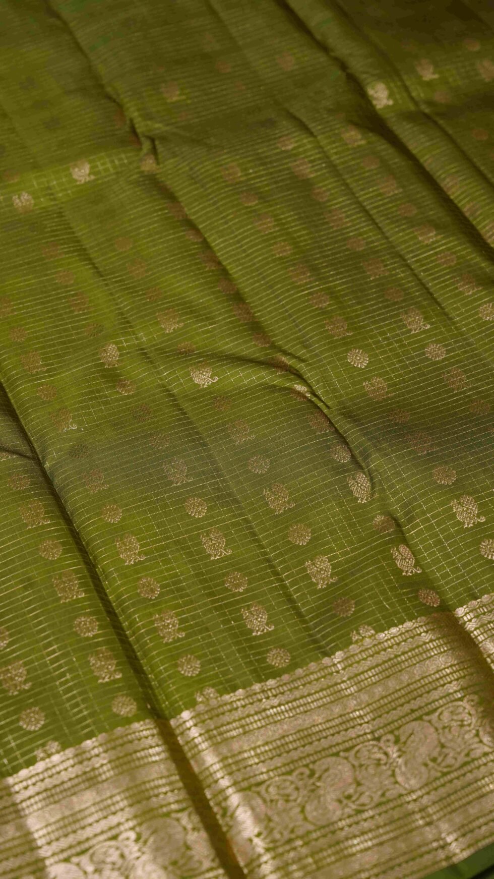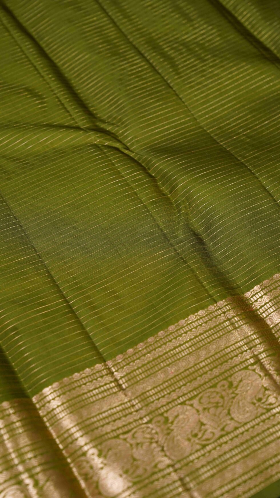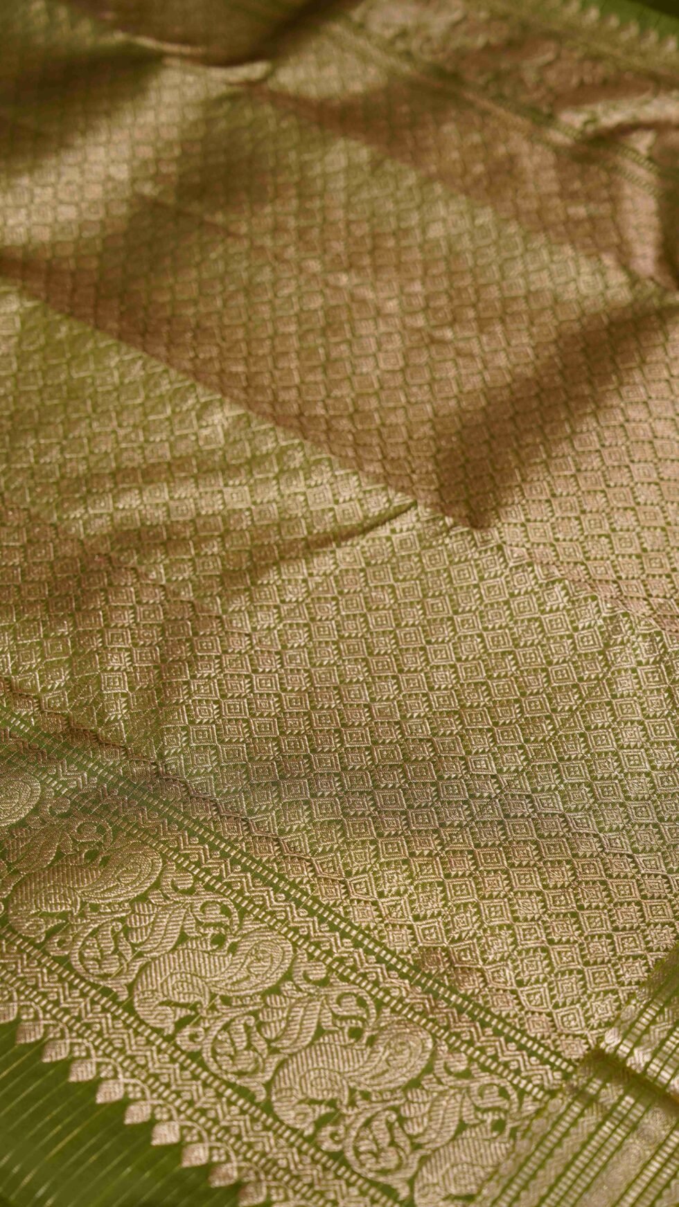 The muted olive tone creates a sophisticated backdrop for the shimmering zari, making it a versatile choice for weddings, festive occasions, or as a treasured heirloom piece. A true embodiment of heritage craftsmanship and spiritual symbolism