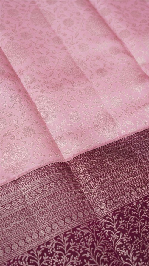 A beautiful light pink Kanjivaram saree, adorned with intricate floral patterns woven in shimmering silver zari. The saree’s delicate beauty is elevated by a striking contrast wine-colored border, featuring elegant creeper designs. The pallu is a masterpiece in itself, with rich wine hues and exquisite floral patterns, crafted in pure zari weaving.
