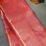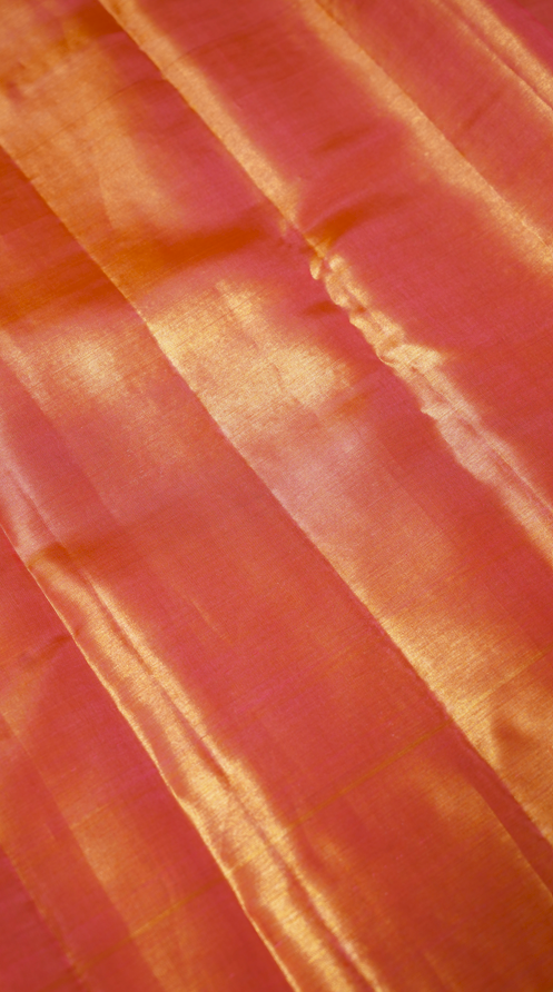 This breathtaking pink tissue Kanjivaram saree is a dazzling expression of elegance and artistry. The body shimmers with a radiant pink-gold sheen, intricately woven with floral and peacock motifs that bring a touch of heritage grandeur. The highlight is its majestic zari meenakari border and pallu, featuring traditional motifs of elephants and floral vines, symbolizing prosperity and regality. The delicate tissue finish enhances the drape’s luminosity, making it an exquisite choice for weddings, festive occasions, and timeless celebrations.