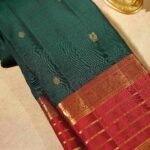 The Harini Kanjivaram Saree is a regal fusion of bold hues and intricate craftsmanship. Its rich bottle green body is adorned with exquisite peacock and chakra motifs in pure zari, symbolizing beauty, prosperity, and cosmic energy.The contrast maroon gap border enhances its grandeur, embellished with horizontal beldari stripes and sacred rudraksha stripes, adding layers of spiritual and artistic significance. A perfect blend of heritage symbolism and vibrant contrast, this saree is a timeless choice for weddings, festive occasions, and treasured heirloom collections