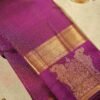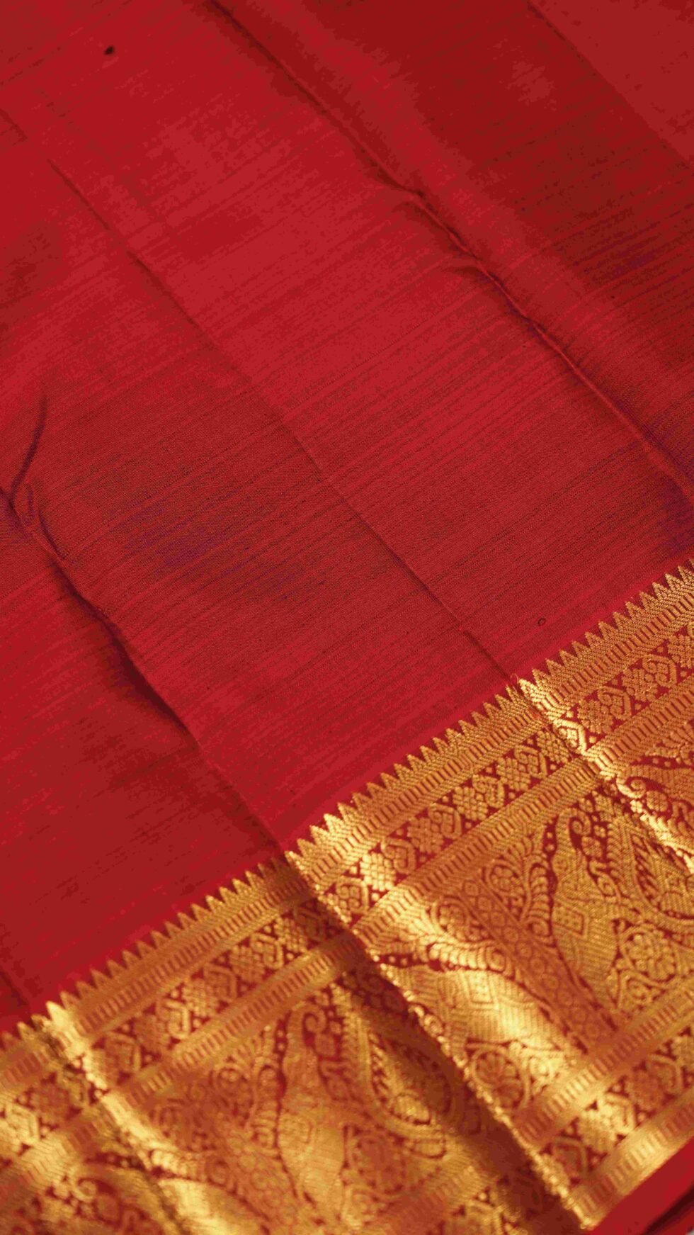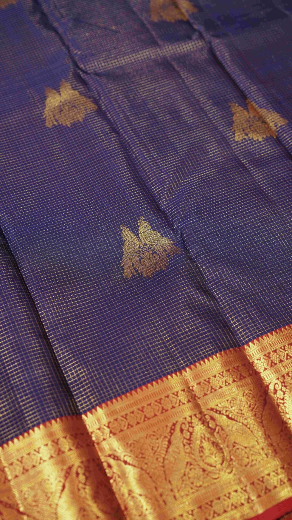 The body, in a luxurious dark blue, is subtly textured with an intricate check pattern. The beauty of the saree is further enhanced by twin parrot motifs woven throughout in shimmering gold zari. A striking contrast is provided by the rich red border, which features grand elephant and detailed floral patterns. This saree is a timeless piece, a fusion of classic motifs and a jewel-toned palette that embodies both traditional grace and regal splendor.