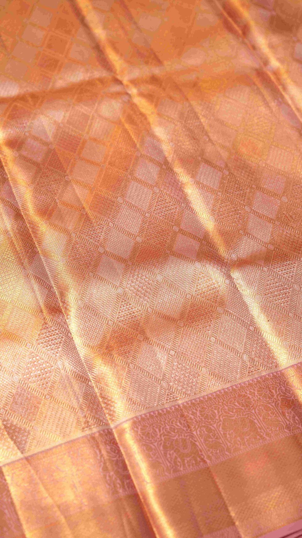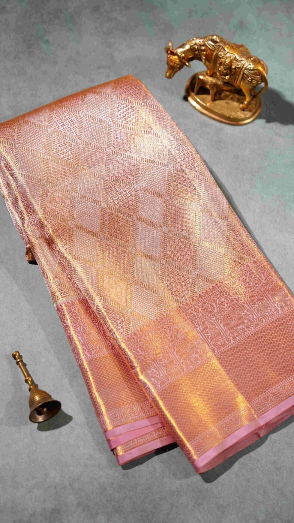 This saree is a masterpiece of light and luxury. Its body, in a unique and elegant light lavender, is woven with shimmering gold tissue, creating a captivating and luminous effect. The entire saree is adorned with intricate diamond patterns, giving it a rich texture. The stunning border is a work of art, featuring finely detailed motifs of elephants and peacocks, symbolizing strength and grace. The grand pallu, resplendent in a rich gold weave, completes this luxurious Kanjivaram, making it a truly grand and beautiful choice for any special occasion.
