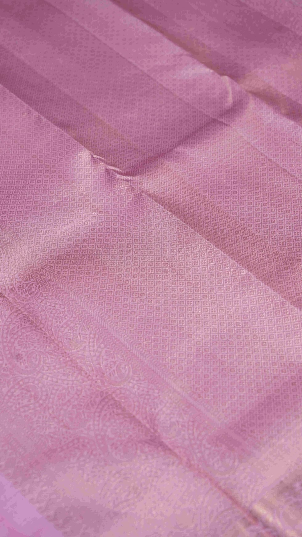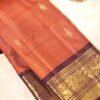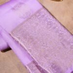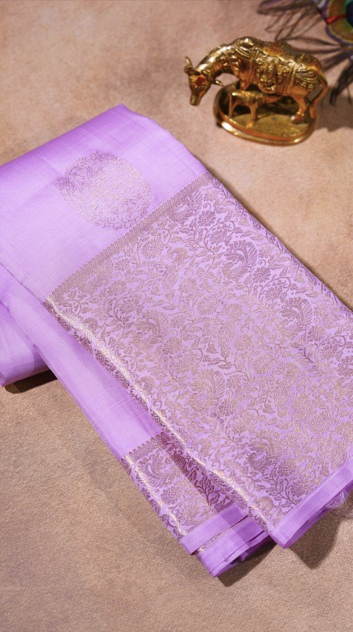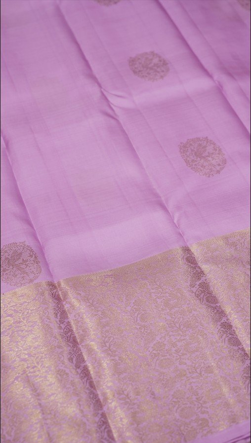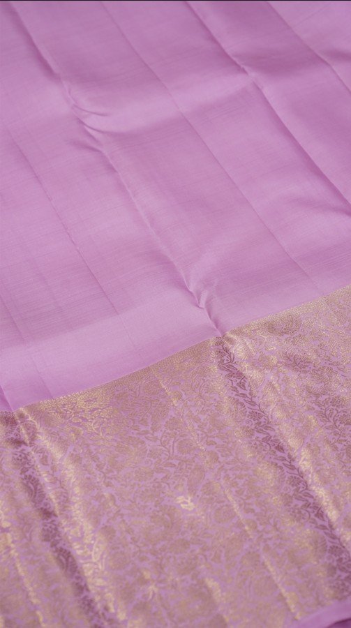 This elegant Kanjivaram saree comes in a soothing lavender body highlighted with intricate gold zari peacock motifs. The border is richly woven with peacock and floral designs in zari, adding depth and heritage charm to the drape. The combination of pastel silk with luminous gold detailing makes it a timeless weave, carrying forward the grace of traditional artistry.