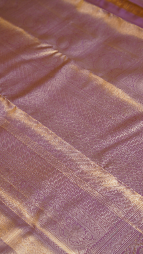 A masterpiece of refined grace, this lavender monotone tissue Kanjivaram saree radiates subtle elegance and timeless charm. The serene lavender body shimmers with a soft metallic sheen, intricately woven in zig-zag patterns and dainty buttas that lend depth and richness. Its highlight is the meenakari border, adorned with traditional artistry and jewel-toned detailing, bringing a vibrant contrast to the pastel base. Exuding a perfect balance of heritage craftsmanship and modern sophistication, this saree is an enchanting choice for weddings, festive occasions, and grand celebrations.
