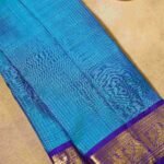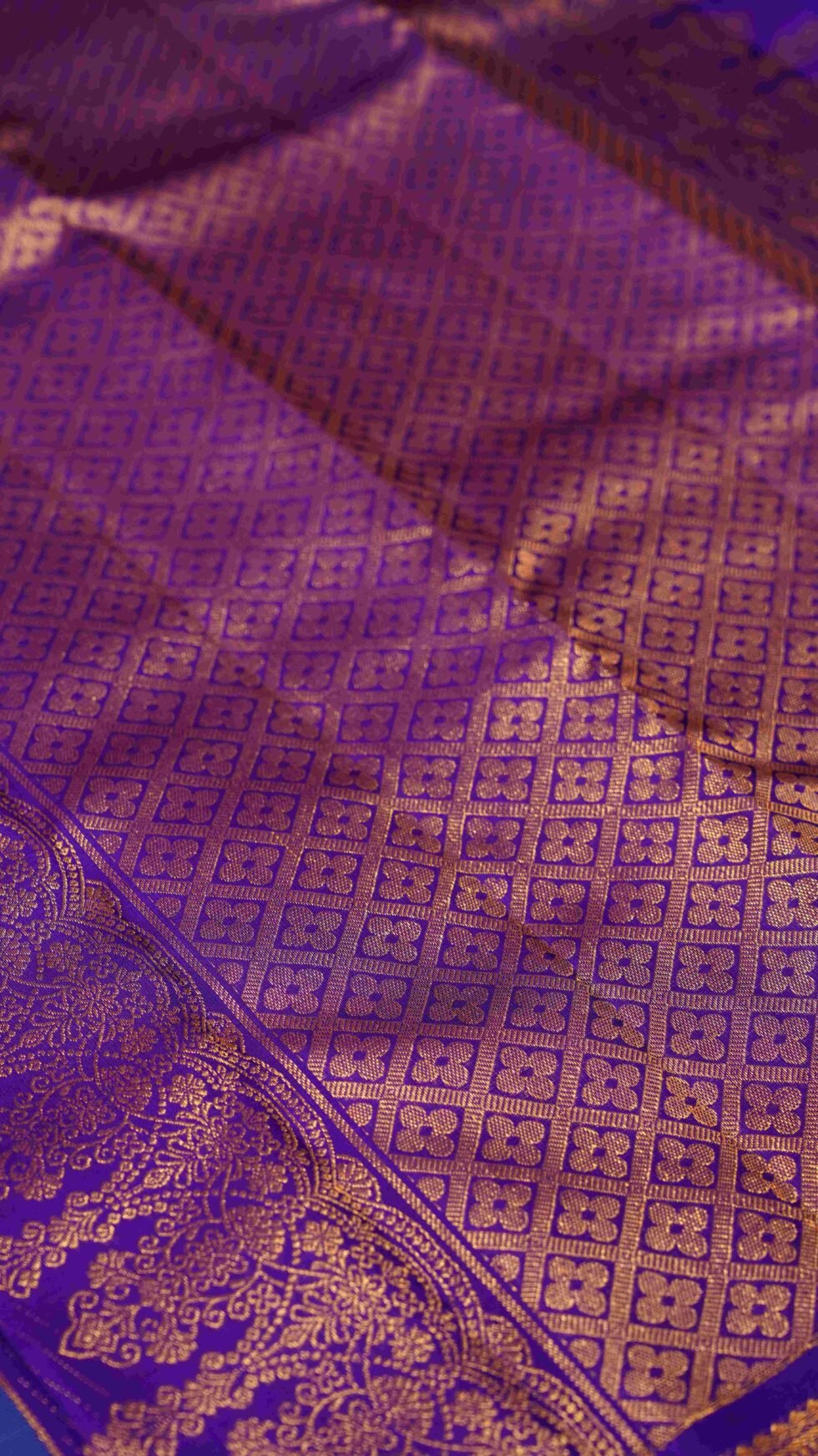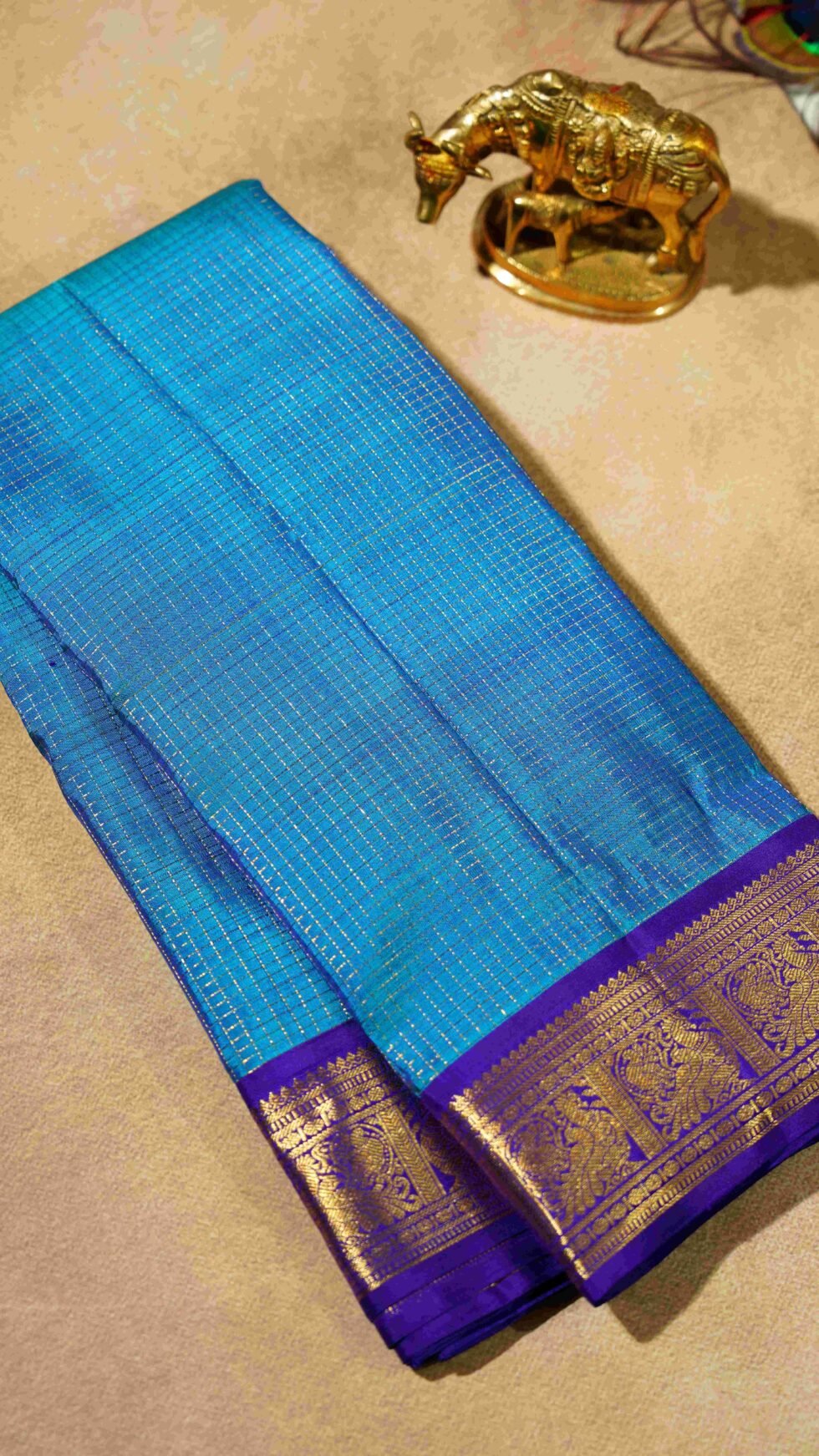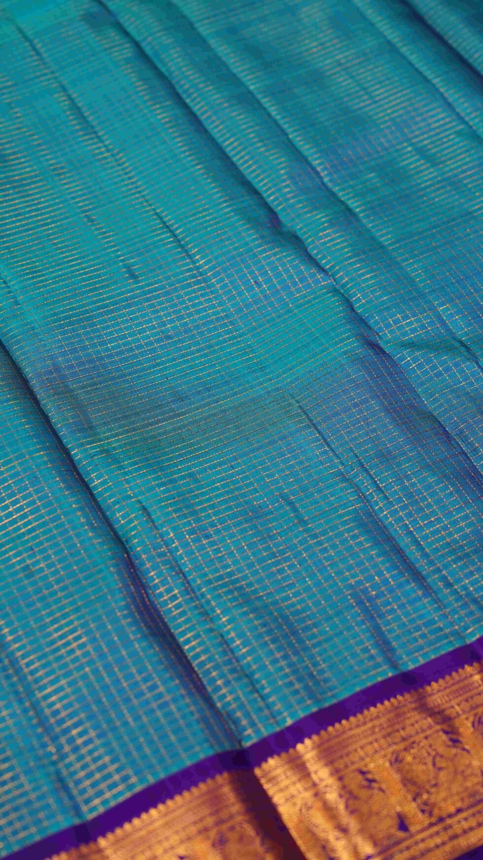 The pure silk body, in a captivating shade of peacock blue, is a canvas for an intricate gold zari check pattern that weaves a story of tradition. The rich interplay of light on the checks creates a mesmerizing effect. A perfectly contrasting dark blue border, woven with fine gold zari, frames the drape with an air of sophisticated simplicity. This saree is a celebration of classic design and expert craftsmanship, perfect for those who cherish heritage and elegance.