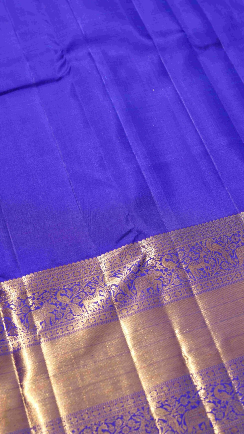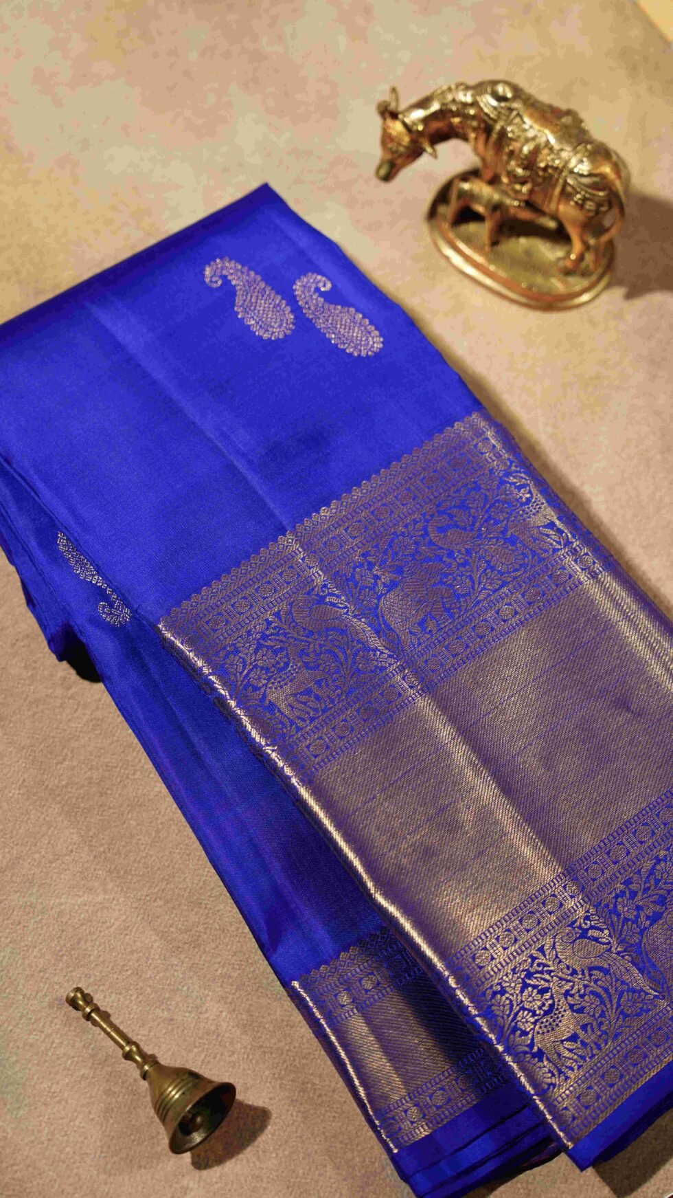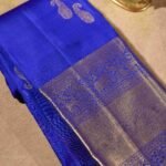This saree is a true expression of regal splendor, its name perfectly reflecting the luxurious royal blue of its body. The fabric is adorned with delicate mango motifs, a classic design element that adds a touch of traditional artistry. The saree’s true grandeur lies in its magnificent pure zari border, which tells a story through its intricate motifs. A captivating tapestry of graceful deer, majestic elephants, and proud peacocks. This saree is a perfect blend of a striking, modern color and classic, timeless motifs, making it an ideal choice for grand celebrations and ceremonies.
