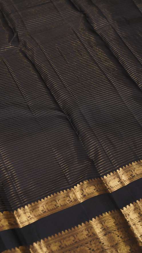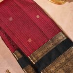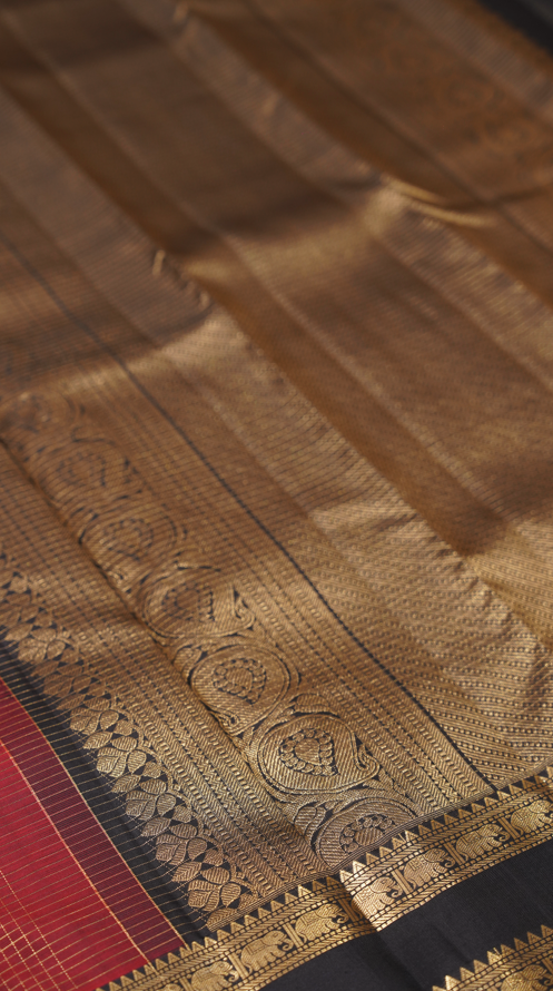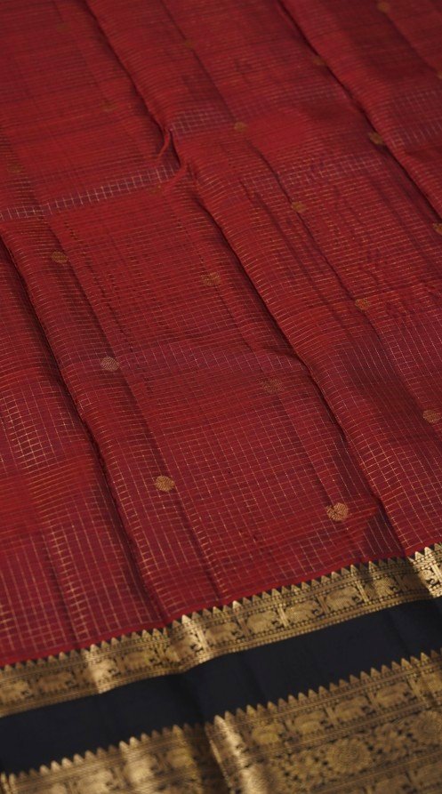 A stunning Maroon Kanjivaram saree featuring an elegant checked pattern across the body, adorned with intricate peacock and floral motifs. The striking black gap border is embellished with majestic elephant designs and delicate floral patterns, adding a touch of grandeur. The saree is completed with a rich gold pallu woven in pure zari, exuding timeless elegance and traditional charm — perfect for weddings and special occasions.