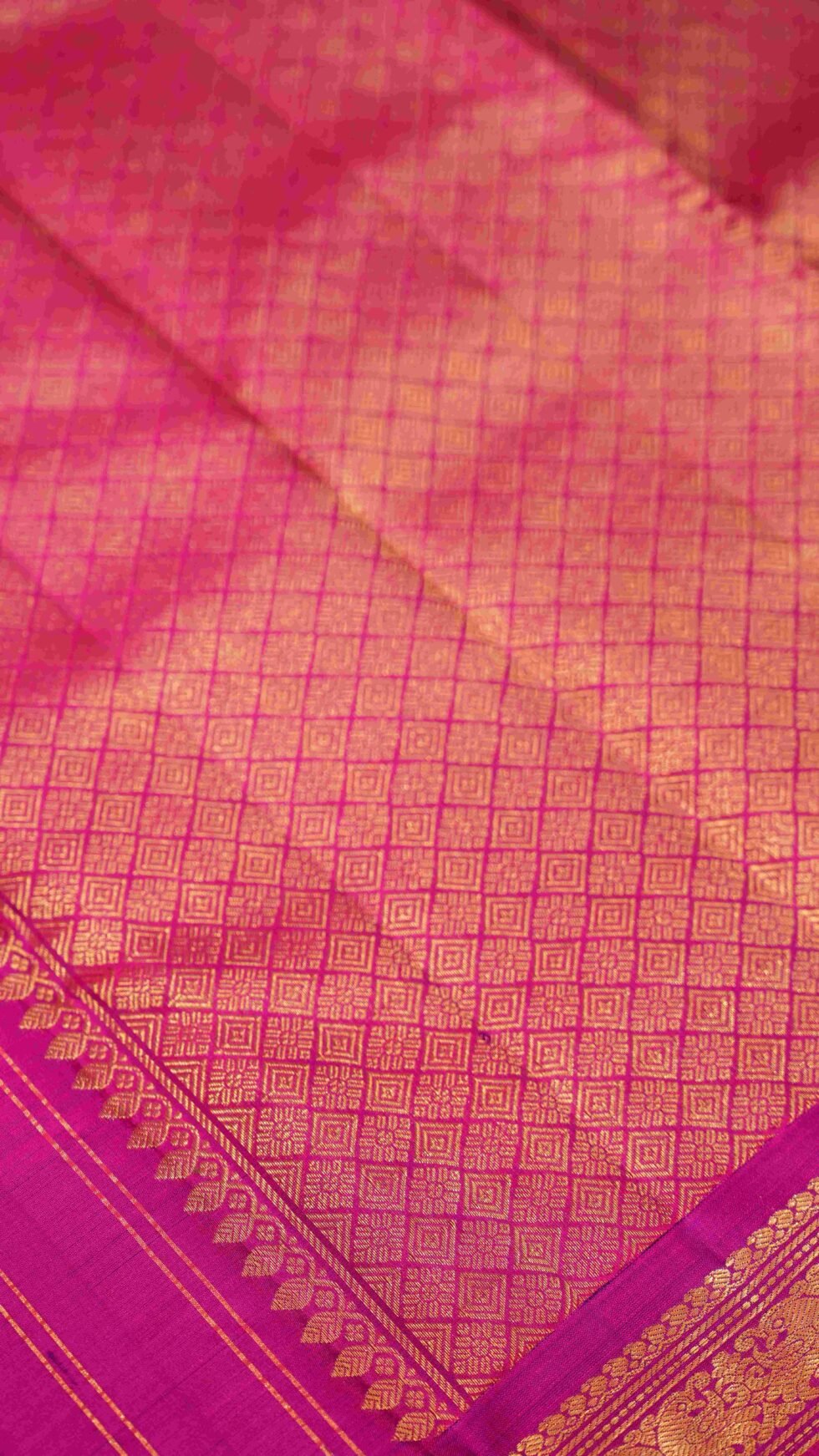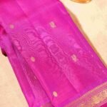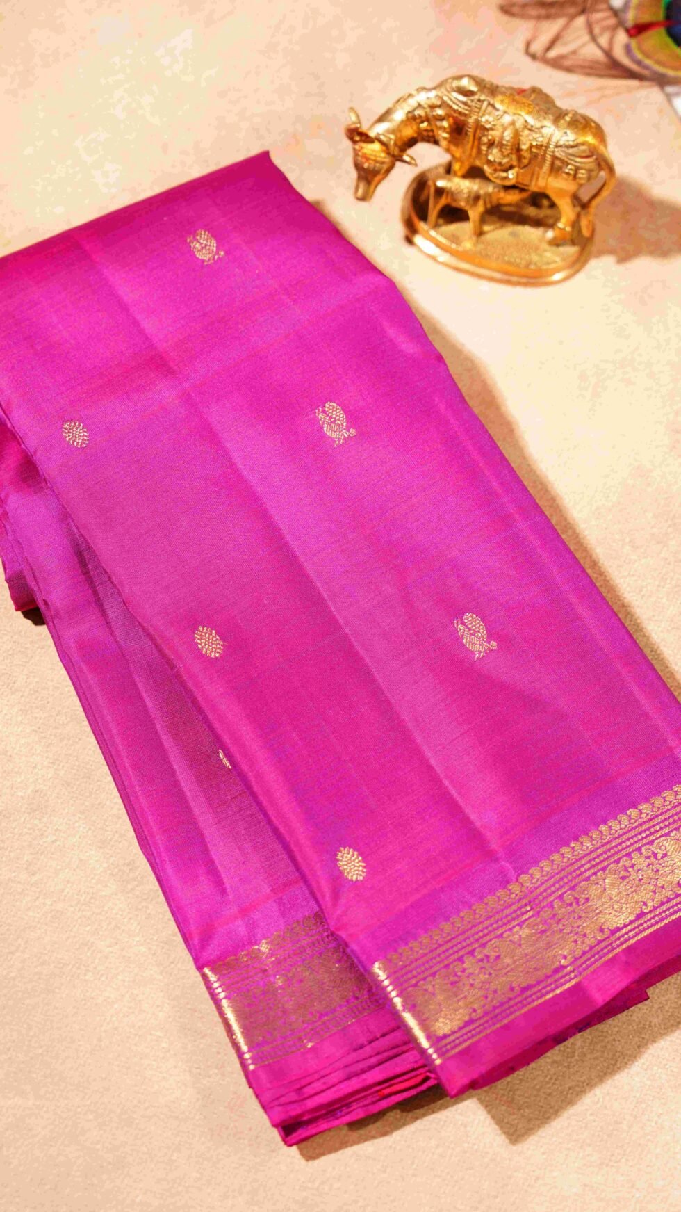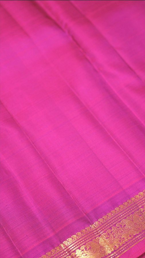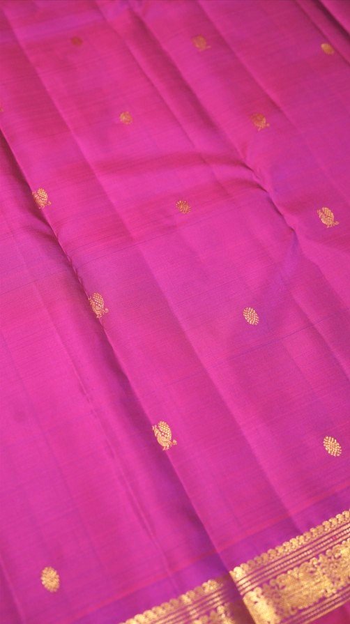 A stunning Kanjivaram silk saree in a rich purple monotone, exuding grace and elegance. The body of the saree is gracefully embellished with a combination of delicate peacock and sacred rudraksha motifs, meticulously woven in gold zari. It features a small, refined border that complements the body’s design, leading to a grand pallu that is lavishly woven with intricate traditional patterns, making it a magnificent and timeless piece for any special occasion.