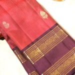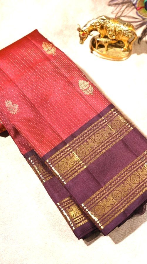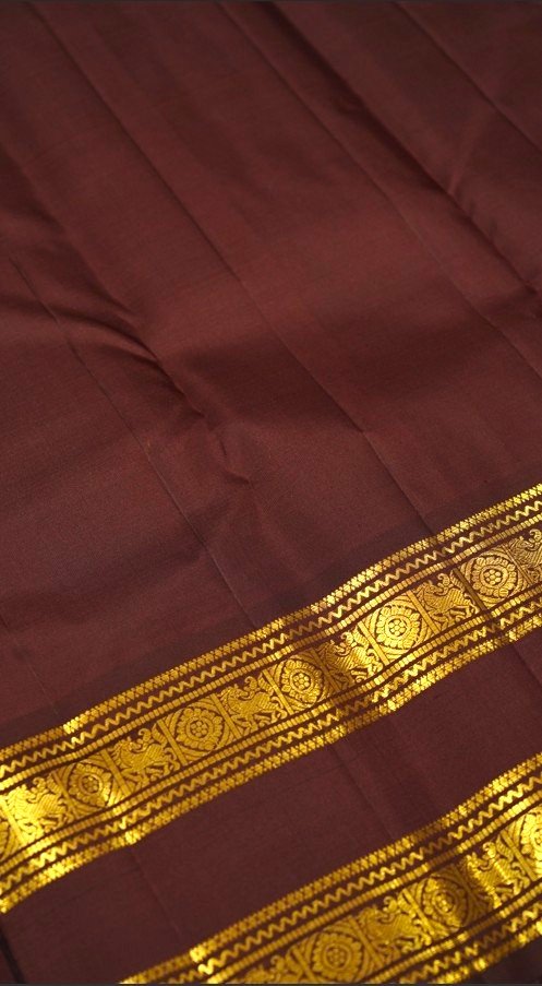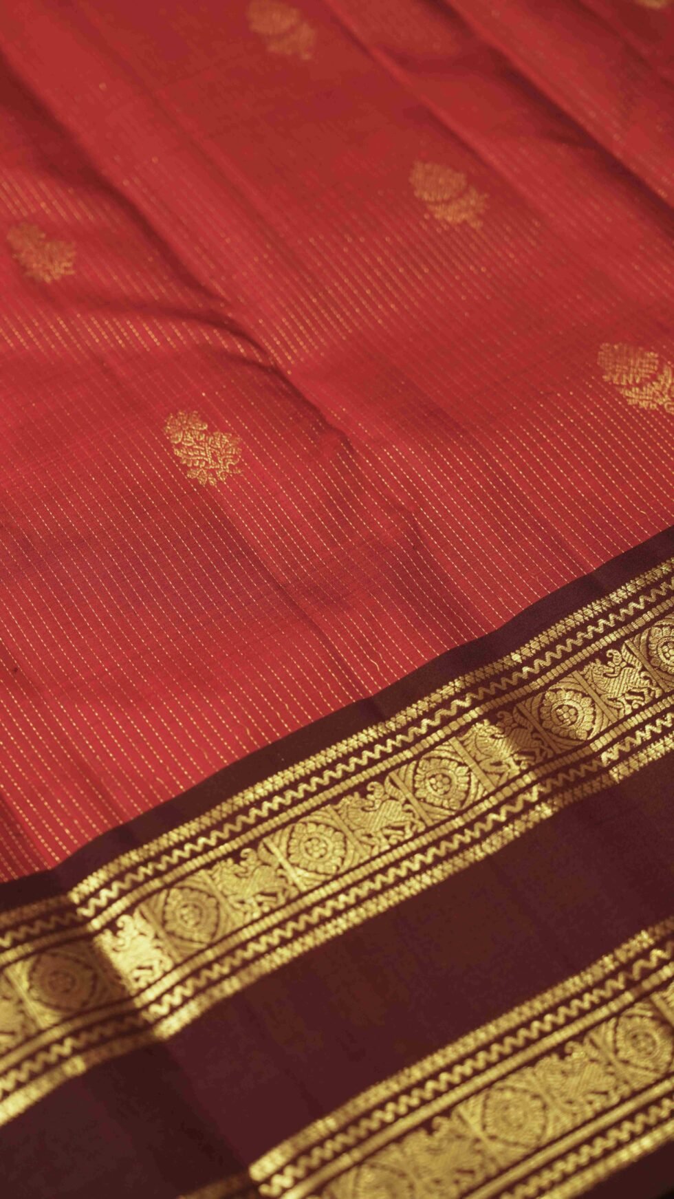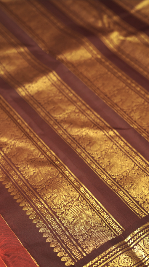 This classic brick red Kanjivaram silk saree is adorned with elegant gold zari floral motifs and vertical stripes, giving it a rich traditional appeal. The saree is enhanced with a contrasting brown gap border intricately woven in zari, adding depth and sophistication.