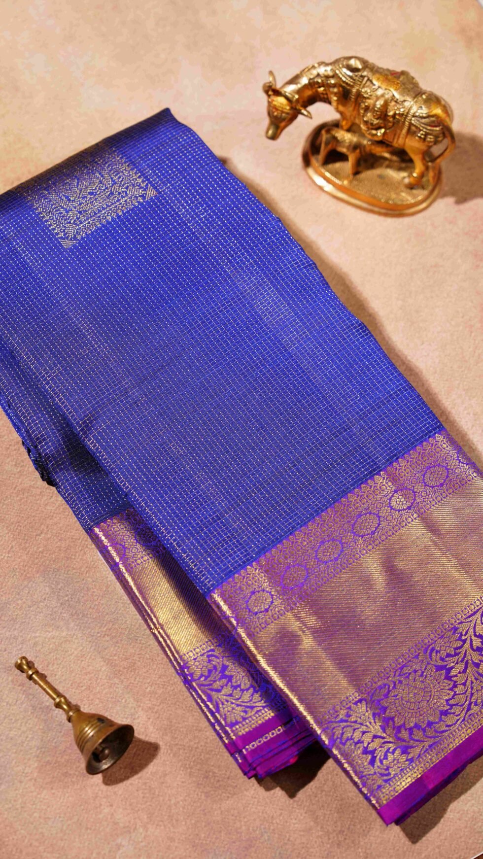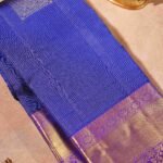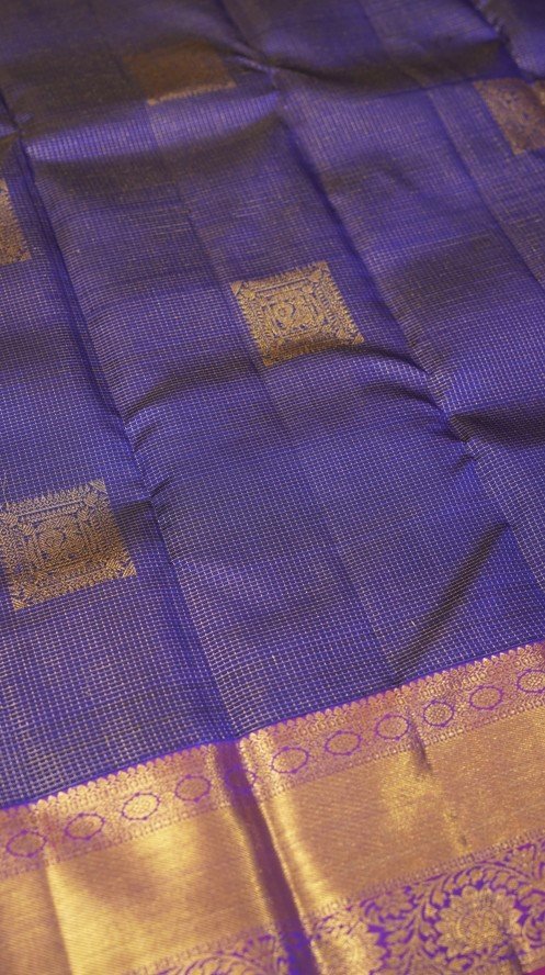 A stunning dark blue Kanjivaram saree featuring a subtle checkered body and large, spaced-out peacock motifs. The saree is finished with a bold purple contrast border, woven with delicate floral patterns in pure zari. The rich and heavy pallu is adorned with a lavish design of peacocks and geometric motifs, all crafted in pure zari, making it a perfect piece for a grand occasion.