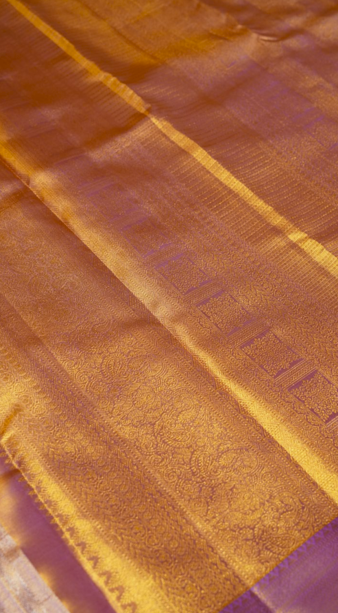 This exquisite lavender tissue Kanjivaram silk saree is a timeless masterpiece of elegance and artistry. The body shimmers with a subtle tissue finish, casting a soft, luminous sheen that enhances its delicate charm. Adorned with thread-woven paisleys, the drape carries a touch of classic tradition, while the gold and lavender chevron-patterned zari border adds striking contrast and grandeur. The interplay of serene lavender with radiant gold makes this saree both refined and captivating—perfect for weddings, festive occasions, and graceful celebrations.