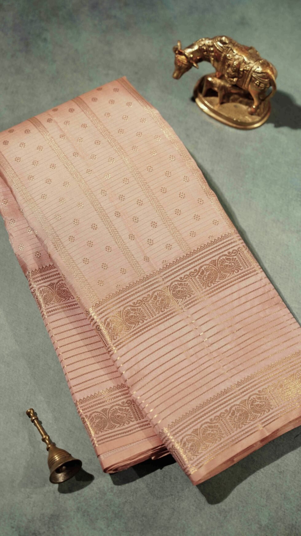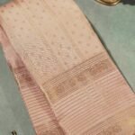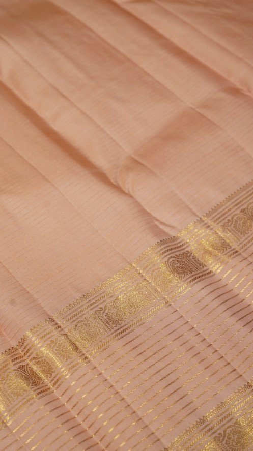 This elegant peach Kanjivaram silk saree is a true embodiment of refined craftsmanship. The body is designed in neat column-like patterns, each column adorned with delicate floral buttas in pure zari, creating a rhythmic and graceful texture across the drape. The gap border is accentuated with fine zari lines, adding a touch of understated luxury and sophistication. A soft sheen runs through the fabric, enhancing its serene peach tone with a luminous charm. Perfect for weddings, festive occasions, and special celebrations, this saree strikes the perfect balance between subtle elegance and traditional artistry.