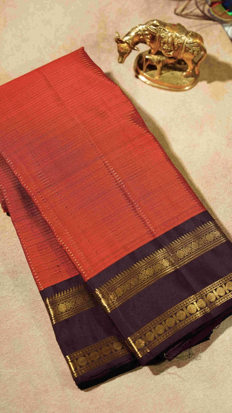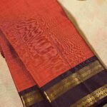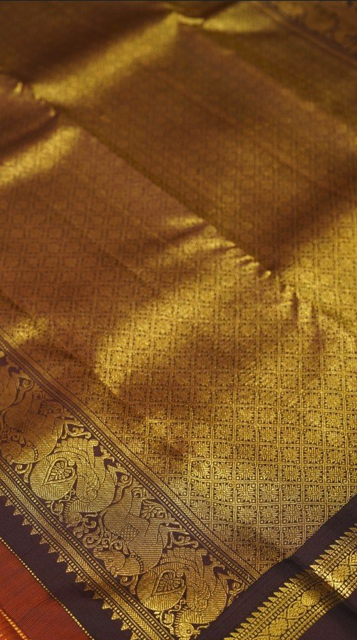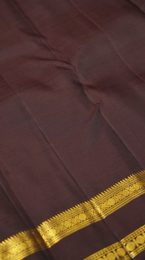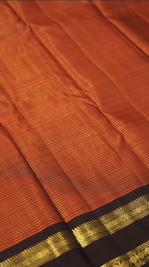 The Tamra Rekha saree presents a warm and inviting rust-orange hue across its pure silk body. Delicate horizontal stripes of shimmering gold zari weave through the fabric, creating a subtle yet luxurious texture. The saree is elegantly finished with a narrow, contrasting dark brown border adorned with traditional gold zari detailing. This saree offers a refined and understated charm, ideal for both festive occasions and more formal gatherings.