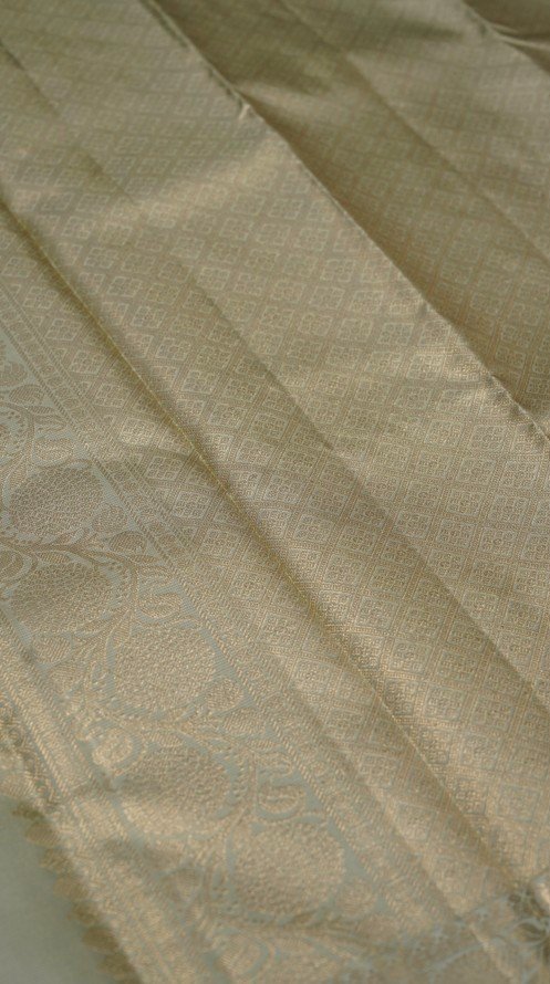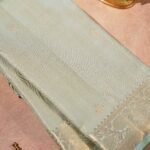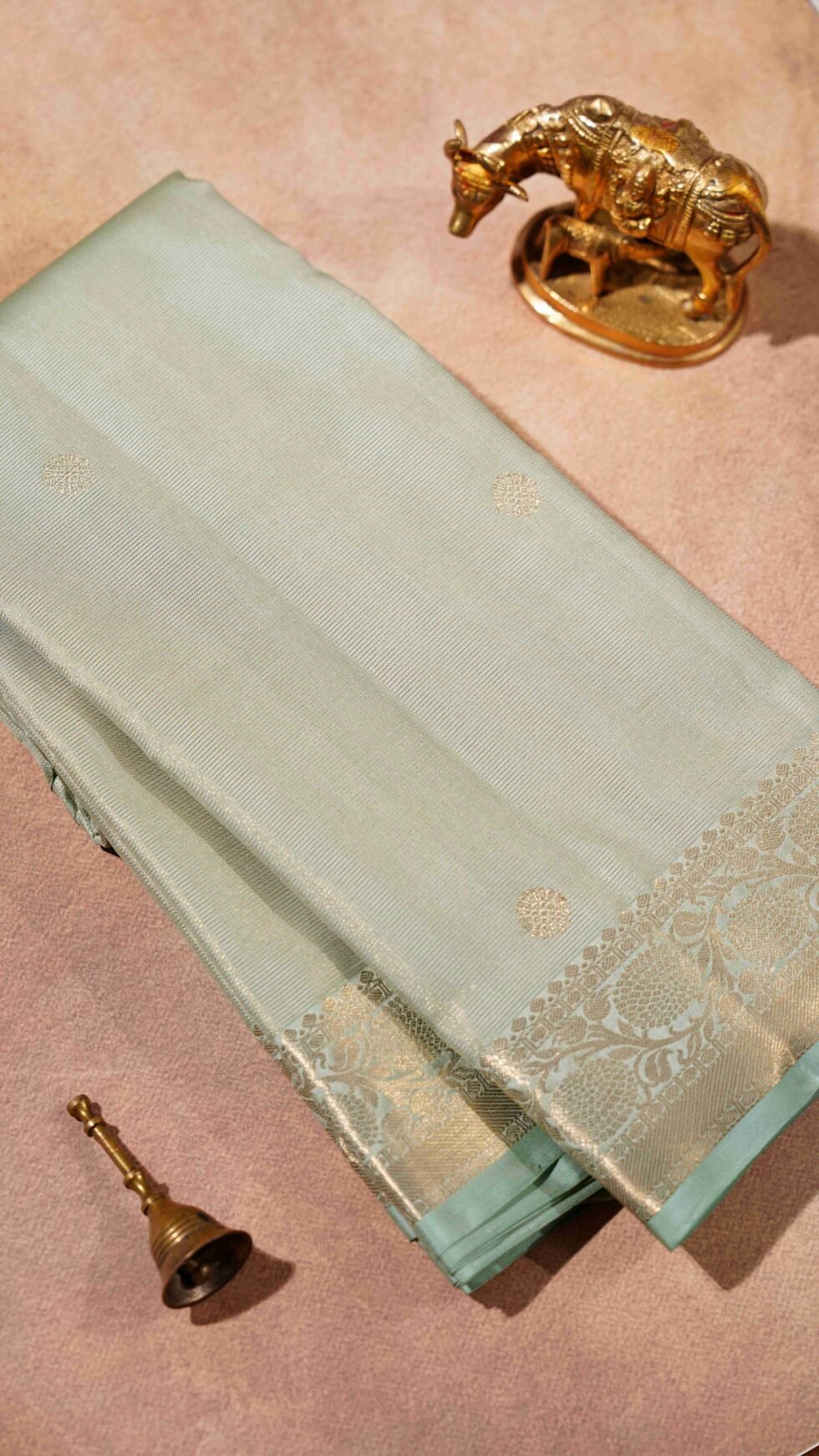 A graceful pastel green monotone Kanjivaram saree, exquisitely woven with horizontal zari stripes that add a subtle sheen and texture across the body. Delicate floral motifs are thoughtfully integrated into the design, enhancing its traditional appeal. The saree is bordered with a finely detailed floral pattern, adding just the right touch of elegance. A richly woven grand pallu completes the look, showcasing intricate craftsmanship and timeless charm. Perfect for occasions that call for understated luxury and classic sophistication.