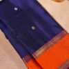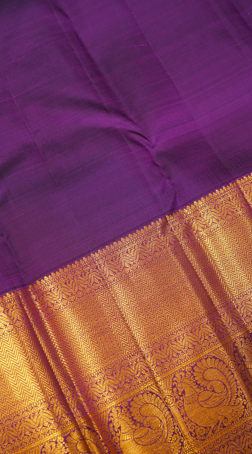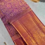 A mesmerizing dark blue and purple dual-shaded brocade Kanjivaram silk saree, intricately woven with majestic peacock and delicate floral motifs in pure gold zari that shimmer with timeless elegance. The medium-sized border adds balance, adorned with traditional detailing that enhances the drape’s grandeur. The rich pallu is a work of art, featuring beautifully woven parrots, floral vines, and geometric patterns, showcasing the mastery of Kanjivaram weaving traditions. Regal, radiant, and resplendent, this saree is perfect for weddings and grand celebrations where heritage meets luxury.