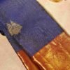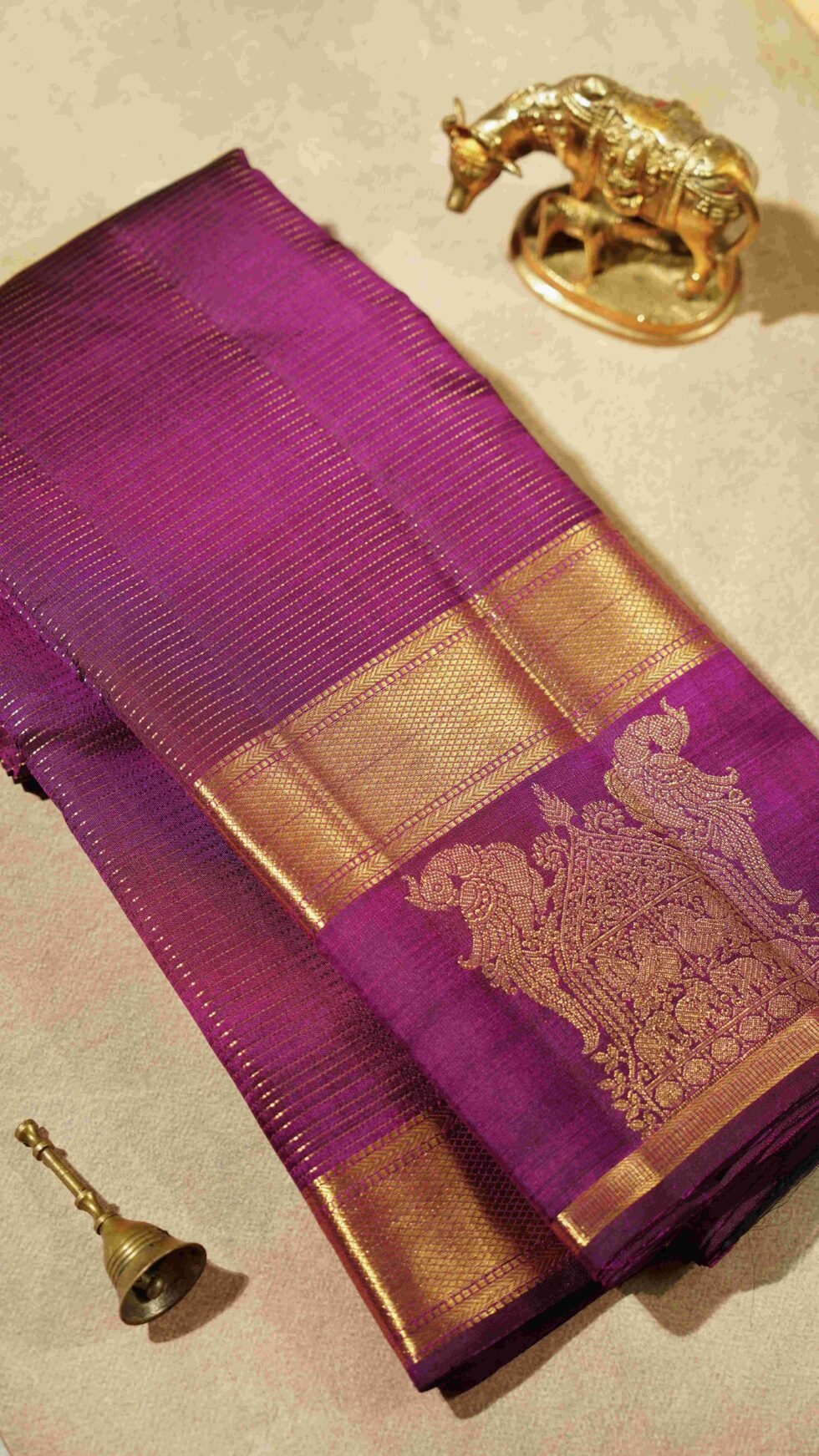 This saree is a striking piece, celebrated for its unique and intricate vairosi pattern that covers its luxurious dark magenta body. This special weave gives the saree a captivating, textured appearance. The border is a visual delight, showcasing a rich tapestry of classic motifs: pairs of graceful parrots and proud peacocks symbolizing beauty and auspiciousness, interspersed with majestic elephants. This saree embodies a rare elegance, a harmonious blend of its distinctive body pattern and a traditionally grand border.