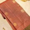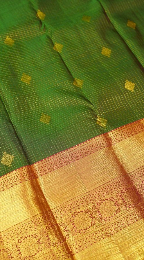 The Vanini Kanjivaram Saree is a vibrant interplay of color and craftsmanship. Its green body is woven with classic checks highlighted by delicate floral motifs in pure zari, creating a balanced yet opulent design.