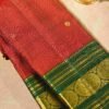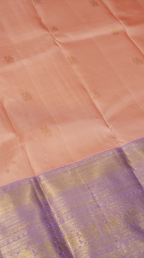 This saree is a breath of fresh air, evoking the gentle and vibrant spirit of spring. Its body, in a soft and subtle peach hue, serves as a delicate canvas for the rich and traditional gold zari work. The saree is beautifully framed by a broad border in a contrasting lavender, which is a masterpiece of intricate weaving. The border features detailed traditional motifs, giving the saree a touch of timeless elegance. The overall design is a perfect blend of modern color and classic craftsmanship, making it a graceful and sophisticated choice for any occasion.
