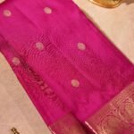 A vibrant rani pink Kanjivaram silk saree, adorned with delicate floral buttas intricately woven across the body. The borders are highlighted with exquisite zari work featuring majestic peacocks, a timeless symbol of beauty and prosperity. Completing the drape is a richly woven grand pallu, showcasing intricate craftsmanship and adding royal splendor. Perfect for weddings, festive occasions, and celebrations where elegance meets grandeur.
