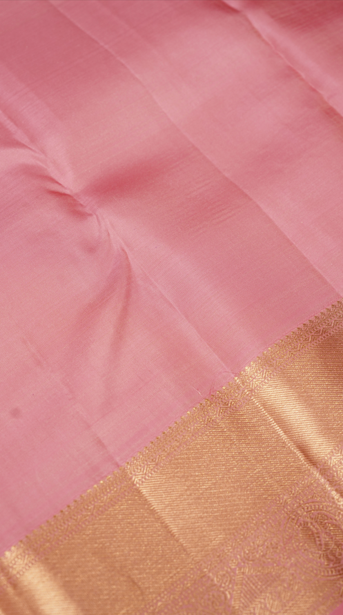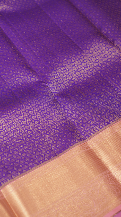This enchanting Kanjivaram silk saree weaves a spell of elegance and sophistication. Rich violet hues, intricate cheques, and delicate light pink accents come together in perfect harmony.Intricate peacock designs on the border and geometric patterns on the pallu, all woven in pure zari, add a touch of luxury and glamour. A true masterpiece of weaving art, this saree is sure to make you feel like royalty